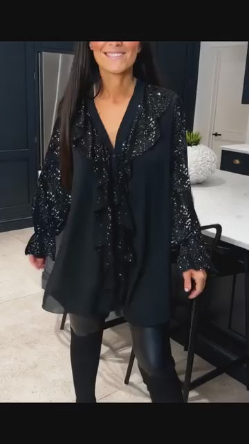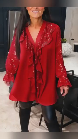 Stilfuldt design: V-hals, lange ærmer og flæsedetaljer for et elegant, men enkelt look.